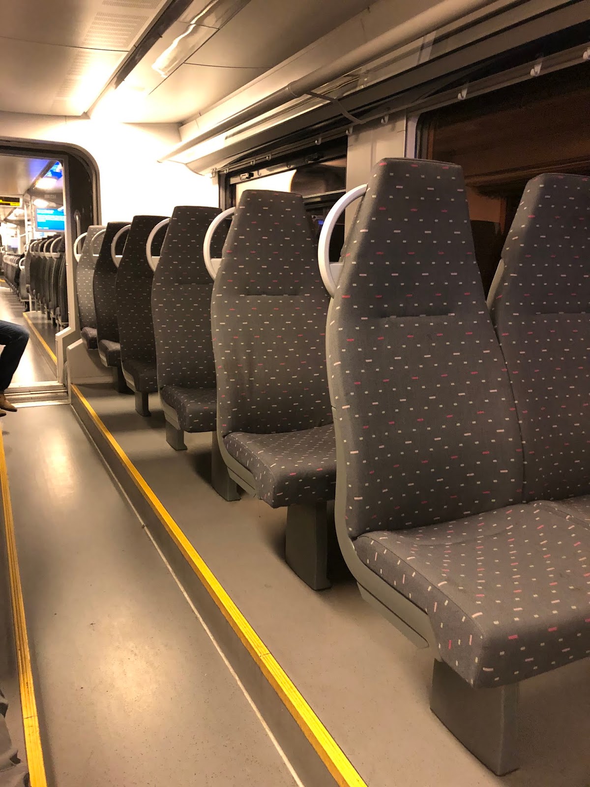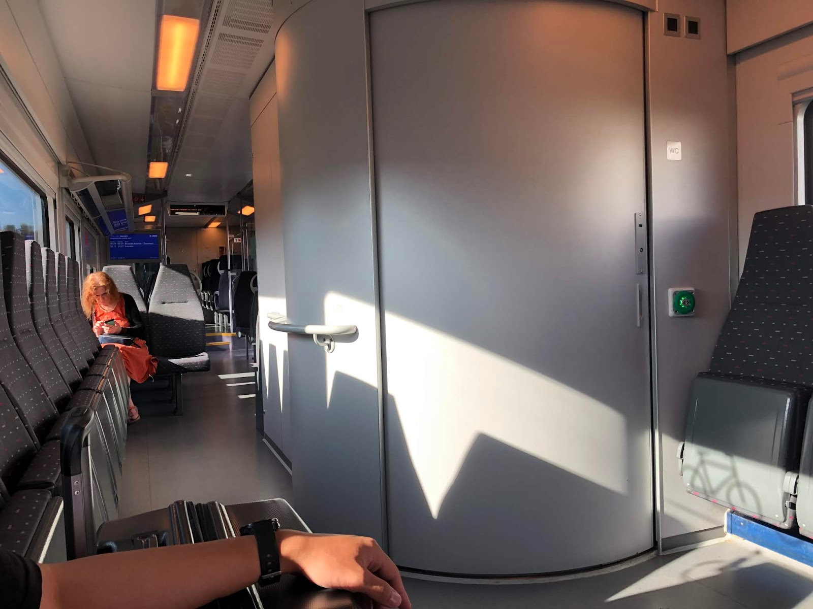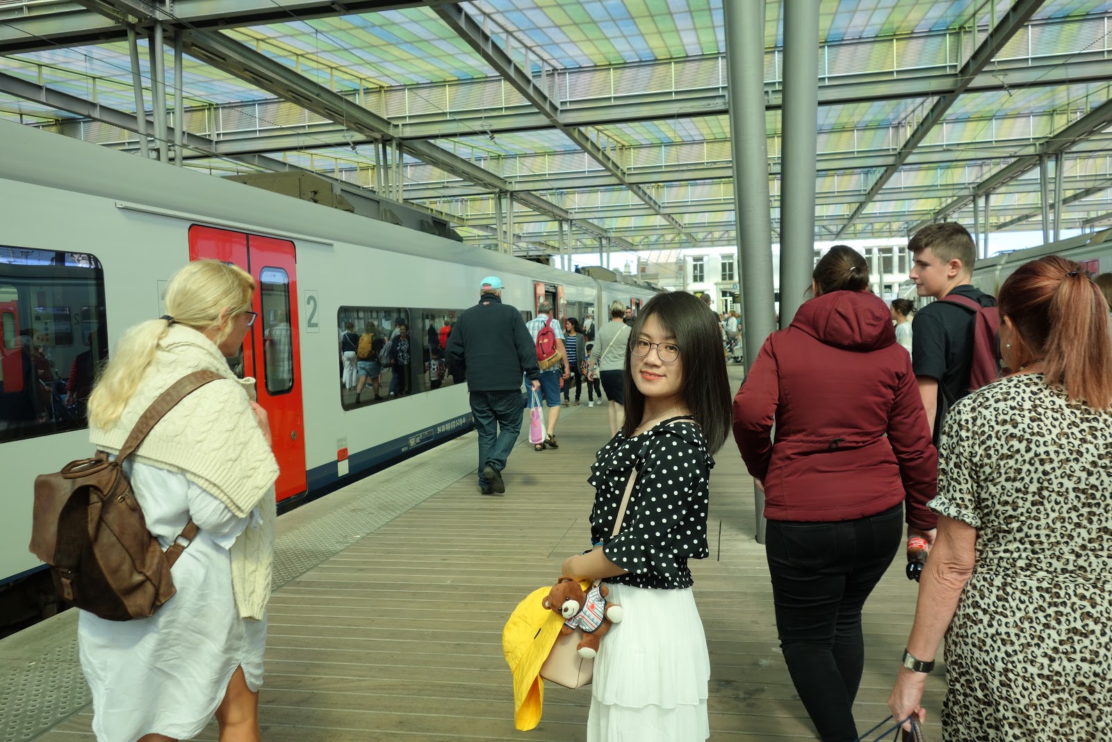 我俩迅速给各自的朋友家人报了个平安,就把手机收起来不想再看了哈哈哈。机场和火车站是连着的。下三层楼直接走到了火车站。火车是在欧洲城市之间旅行的主要交通工具之一,类似于中国的地铁。每一个小时一趟,有专门的APP可以查到列车时刻。欧洲的火车站有些老旧但不脏乱,还有一点文艺的气息,可能是经常出现在电影里面。我们走到站台里没等几分钟,就等到了九点多的火车。车上几乎没几个人,车里面的设备还挺新的,也非常干净。窗外是风景并不惊艳甚至有些荒凉的城市郊区。这是我第一次来欧洲,竟然有种似曾相识的感觉,可能是平时电影看多了的缘故吧……