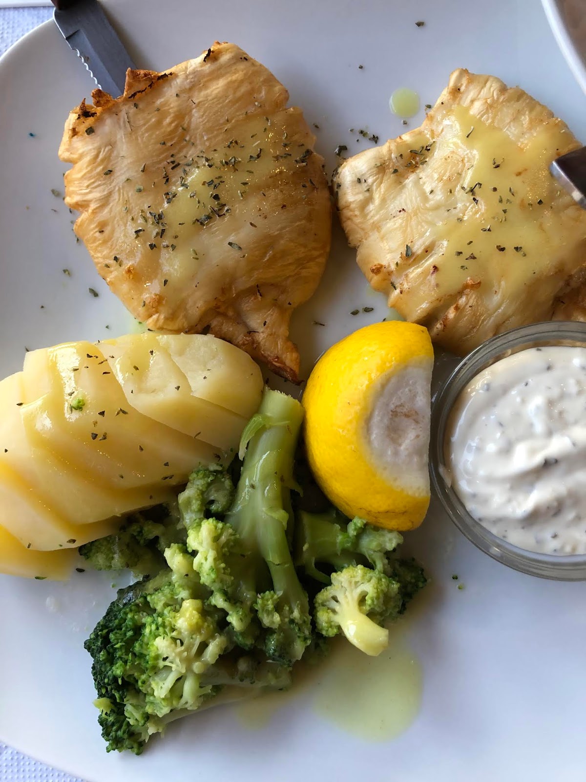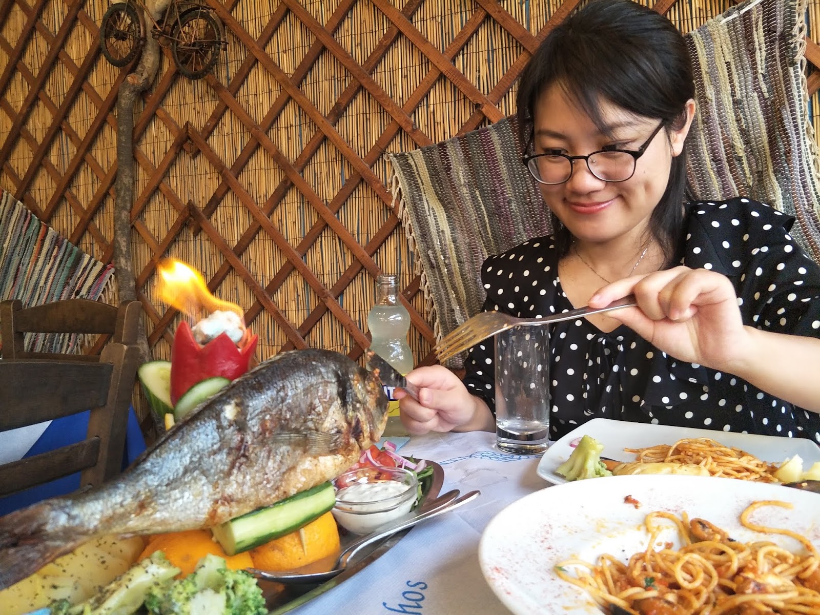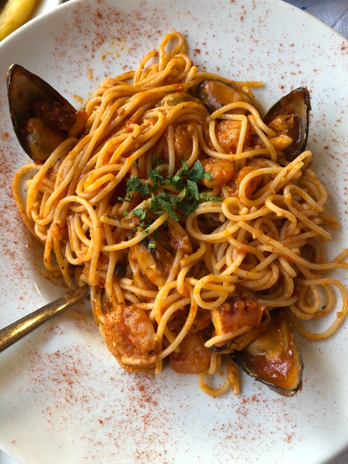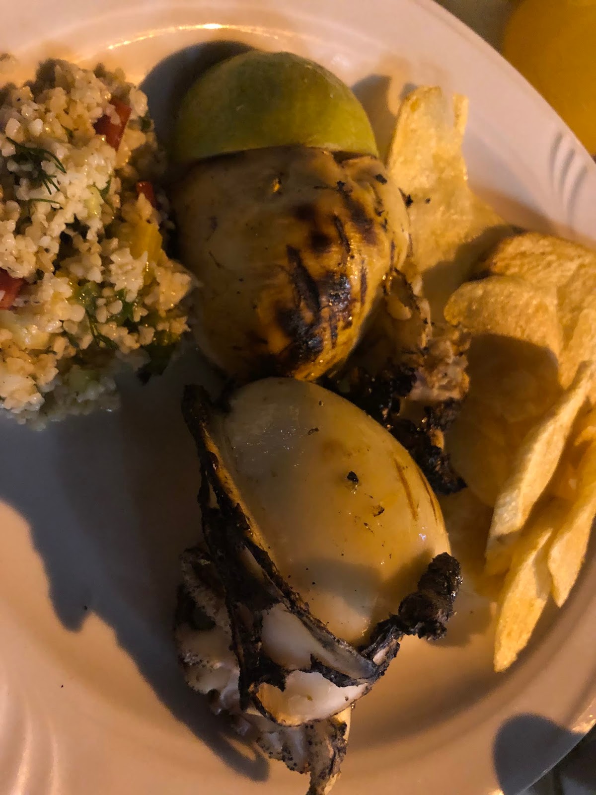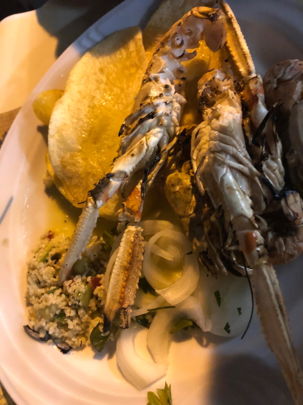 这么多餐馆,真不知道该挑哪家了,每一家看上去都很热闹,装饰都很漂亮。我们本来是跟着谷歌导航,打算选评价最高的那家店,可是走着发现每家店都差不多,于是想着择店不如撞店,不打算跟着导航走了,就地选了一家。服务员很热情,我们又是一如往常的点了巨多。海岛民风淳朴,我们没想到饭菜的分量都那么大。最后实在吃不完了,只能打包了。