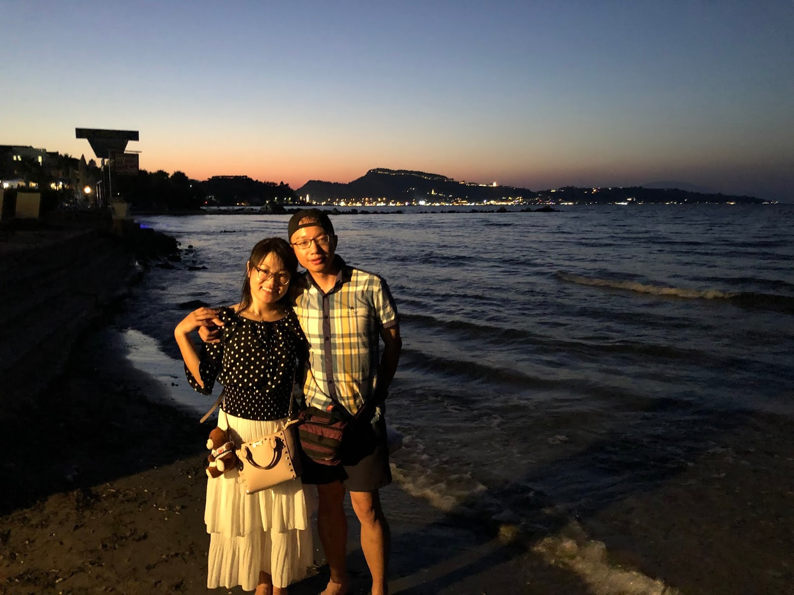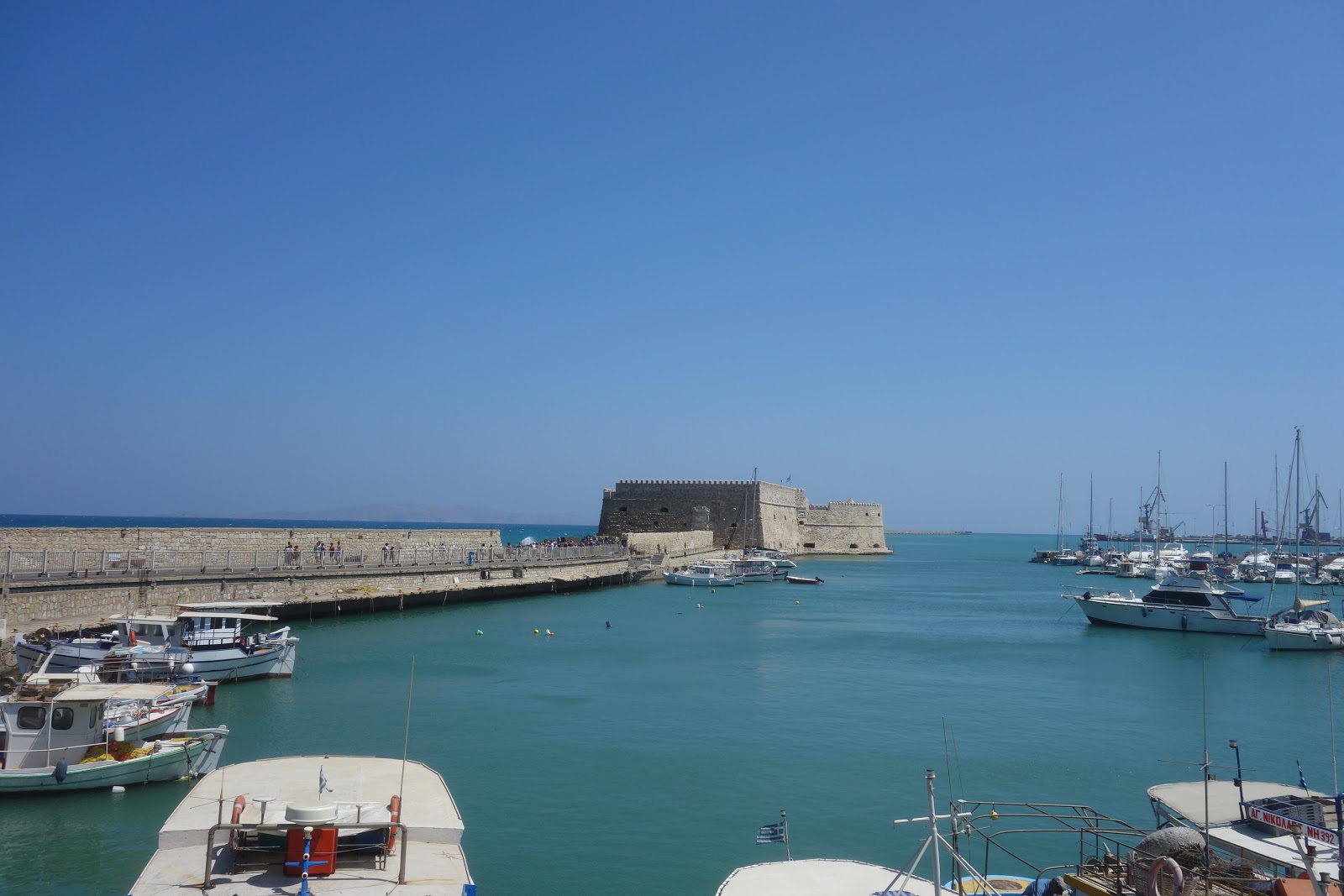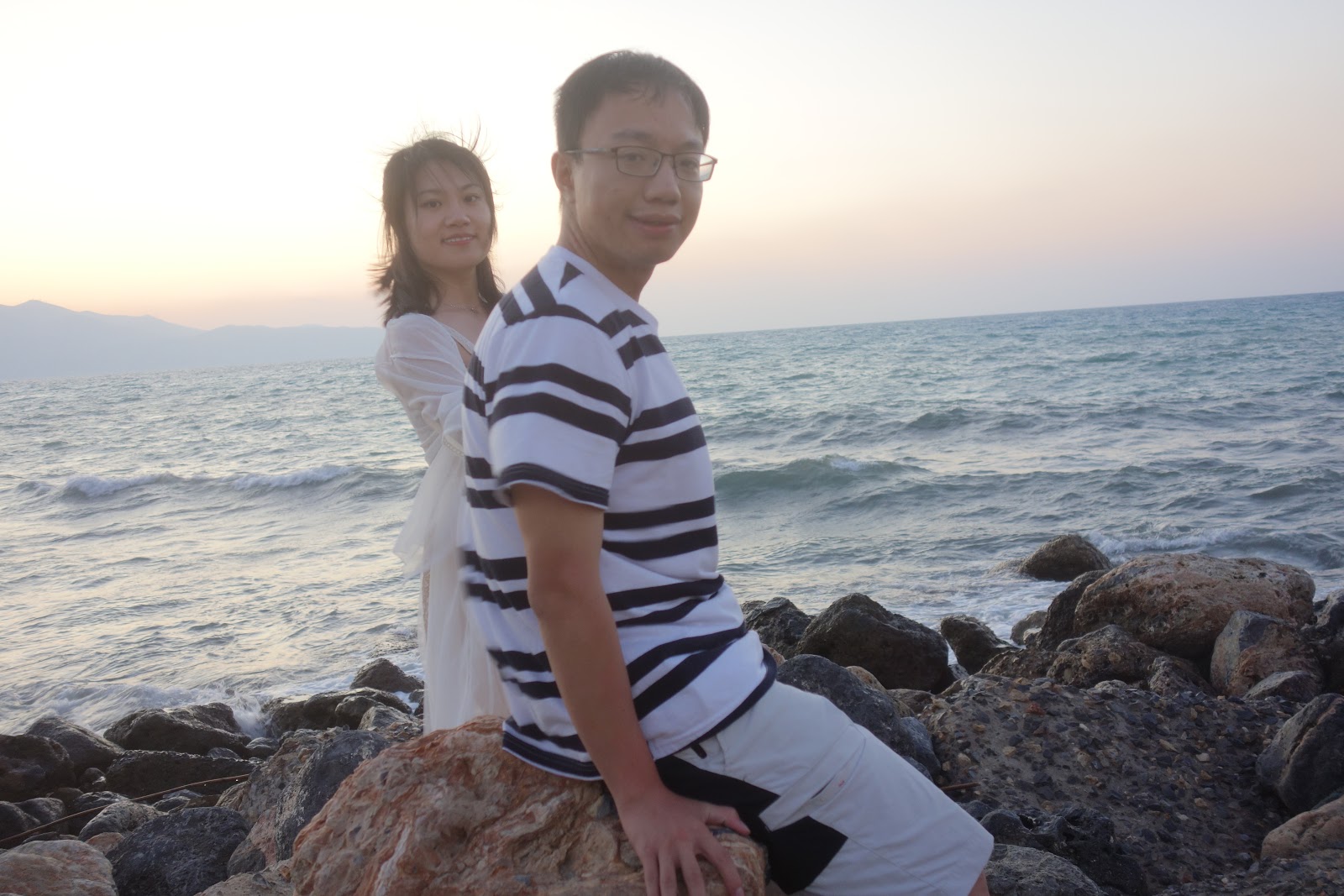 终于见到爱琴海啦,深蓝色的海水拍打着黑色的礁石,夕阳为土黄色的要塞建筑镀上一层金色,悠闲的克里特人在要塞长廊上散着步,此时我的脑海里似乎自动播放着舒缓的音乐。我不停的录像,想记住这一刻的美好。熊还把相机的自拍模式打开,我俩自拍了很多照片。直至夕阳完全西沉下去,我们才离开海岸,准备去觅食。
