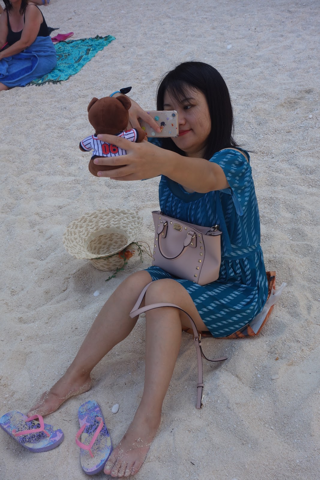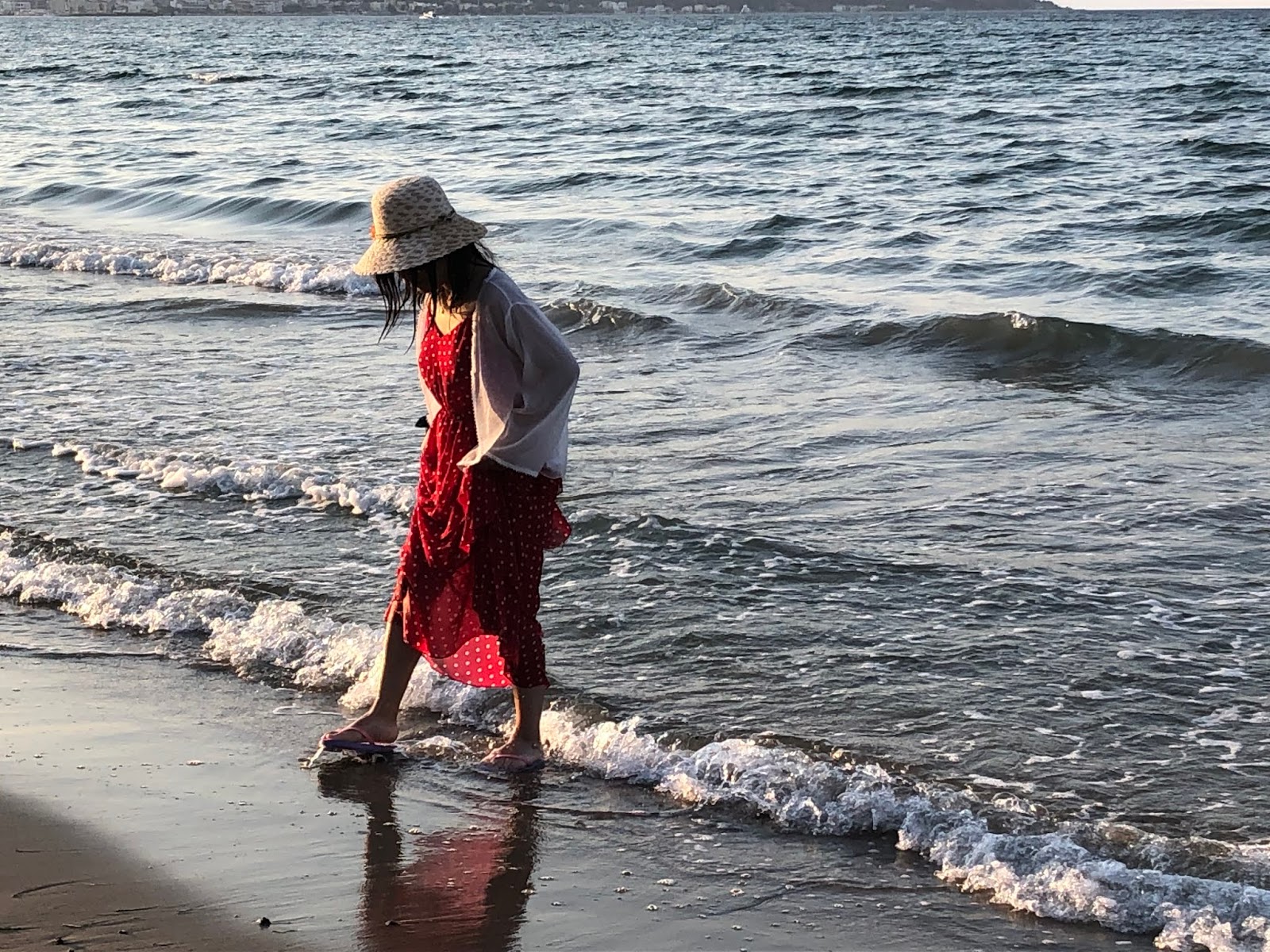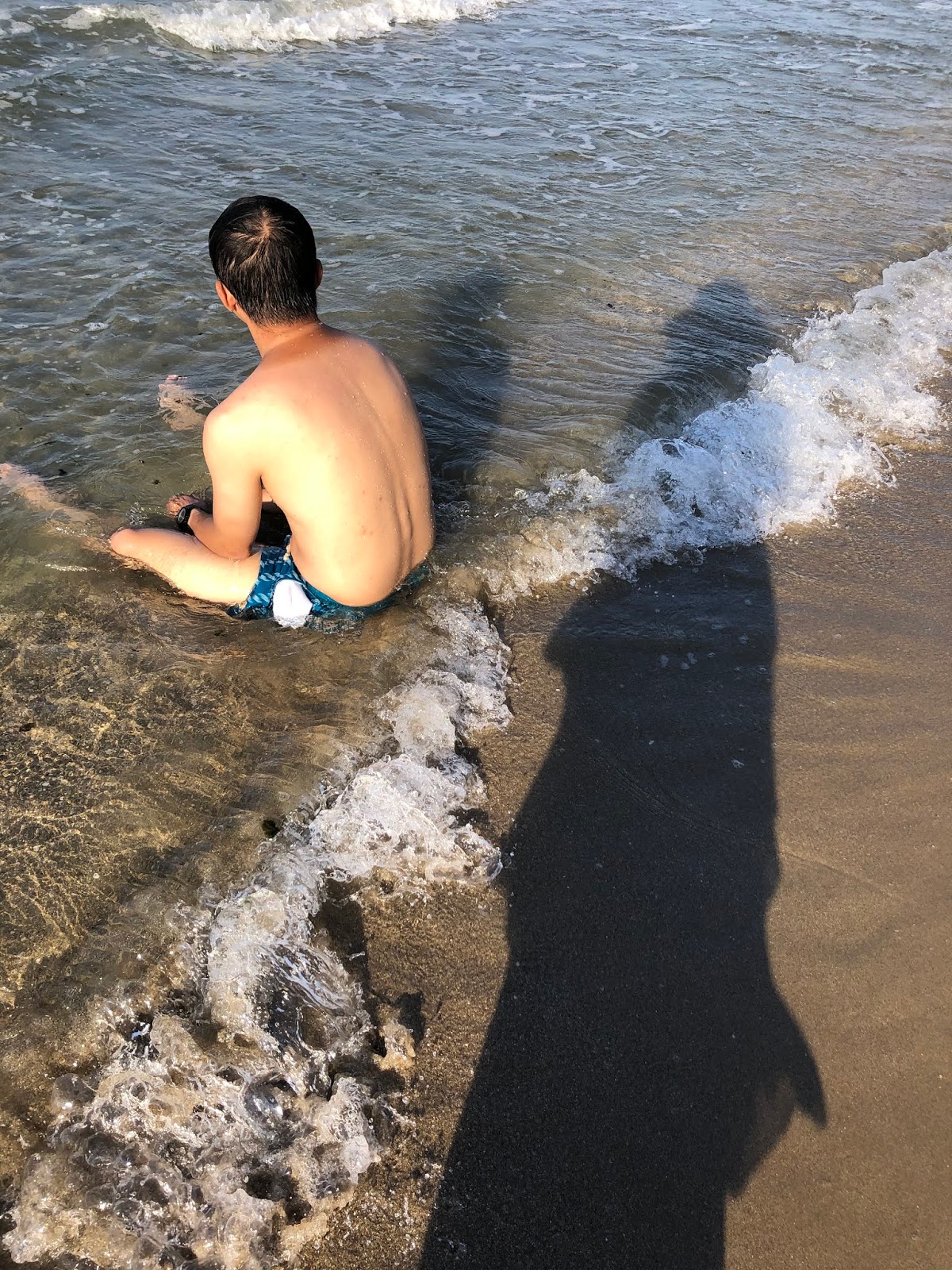 来到海边,我俩在浅海里打闹,本来熊要教我游泳,但我头一埋进海水里就狂喝海水。那一会儿就喝了好几口海水。没办法只能让他自己去游了,我跑到岸边放松。某人在海里游了好久,还给我捡了许多小贝壳。