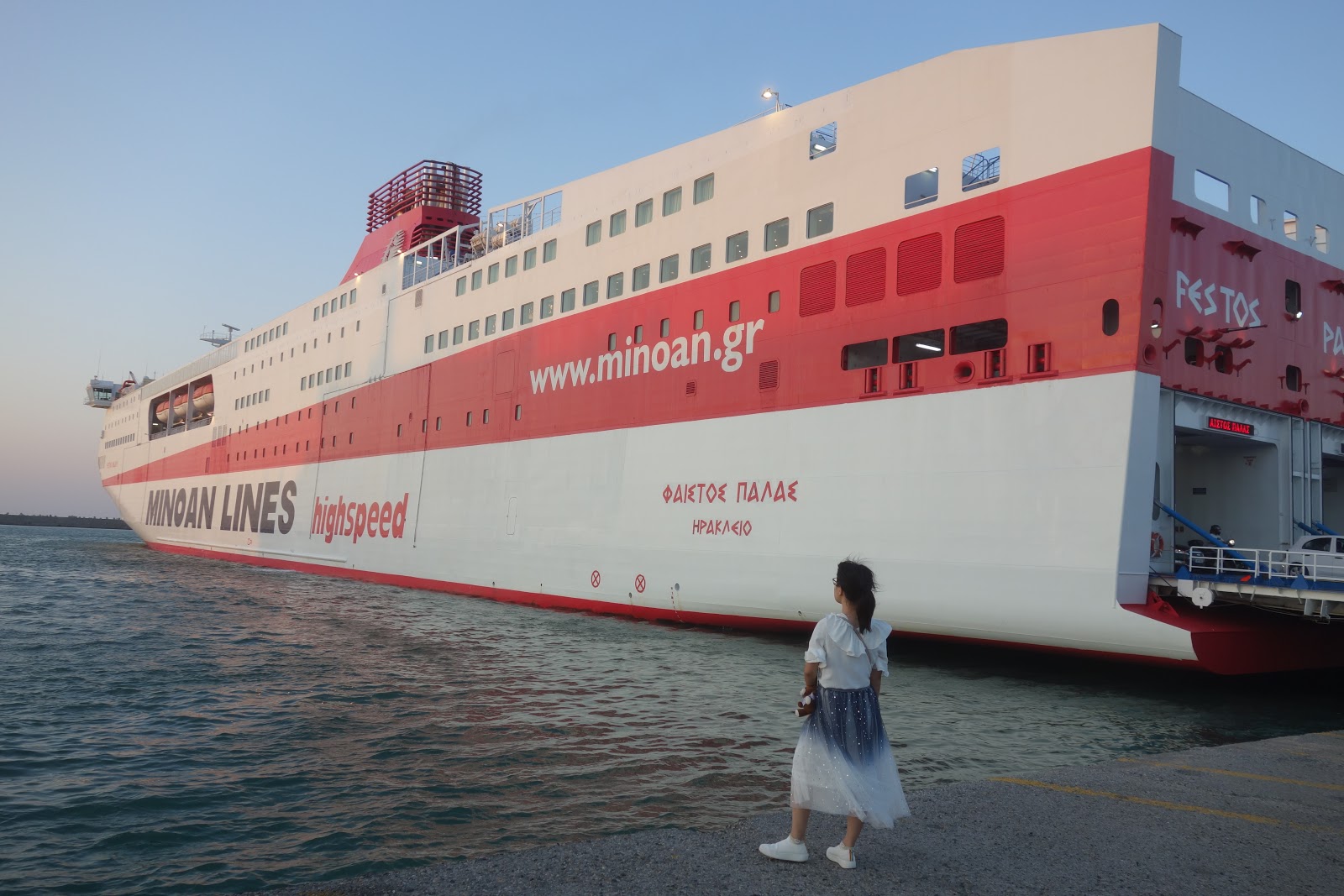 我们坐的邮轮叫米诺线(Minone Line),应该是以米诺斯文明命名的。船体是红色的,码头还有很多其他的船,还有一艘蓝色的船,叫Blue Horizon,目测比我们的船还要大。我们和船合照了很多照片,不过也是只有我跟船合照哈哈哈,某人负责拍照。拍完照片去排队登船。先是有很多雅典来的人下船(因为这艘船也是刚刚靠岸的),还有好多汽车开下来。排了好久,队伍终于开始移动了。希腊作为一个拥有众多岛屿的国家,海运应该是非常主流的交通方式之一,人们坐船就跟我们坐高铁一样普遍,排队的人很多。check in 之后,进船,有一种置身于泰坦尼克号电影的感觉,装潢金碧辉煌的。我们超级兴奋。我们在Deck 7,但不知道怎么走,去前台问了之后,竟然有个工作人员要亲自领我们去房间。还帮我们拿行李。才发现我们享受的是VIP待遇。因为包间是VIP,甲板座位则是普通舱,就类似于火车卧铺和坐票的区别。。。