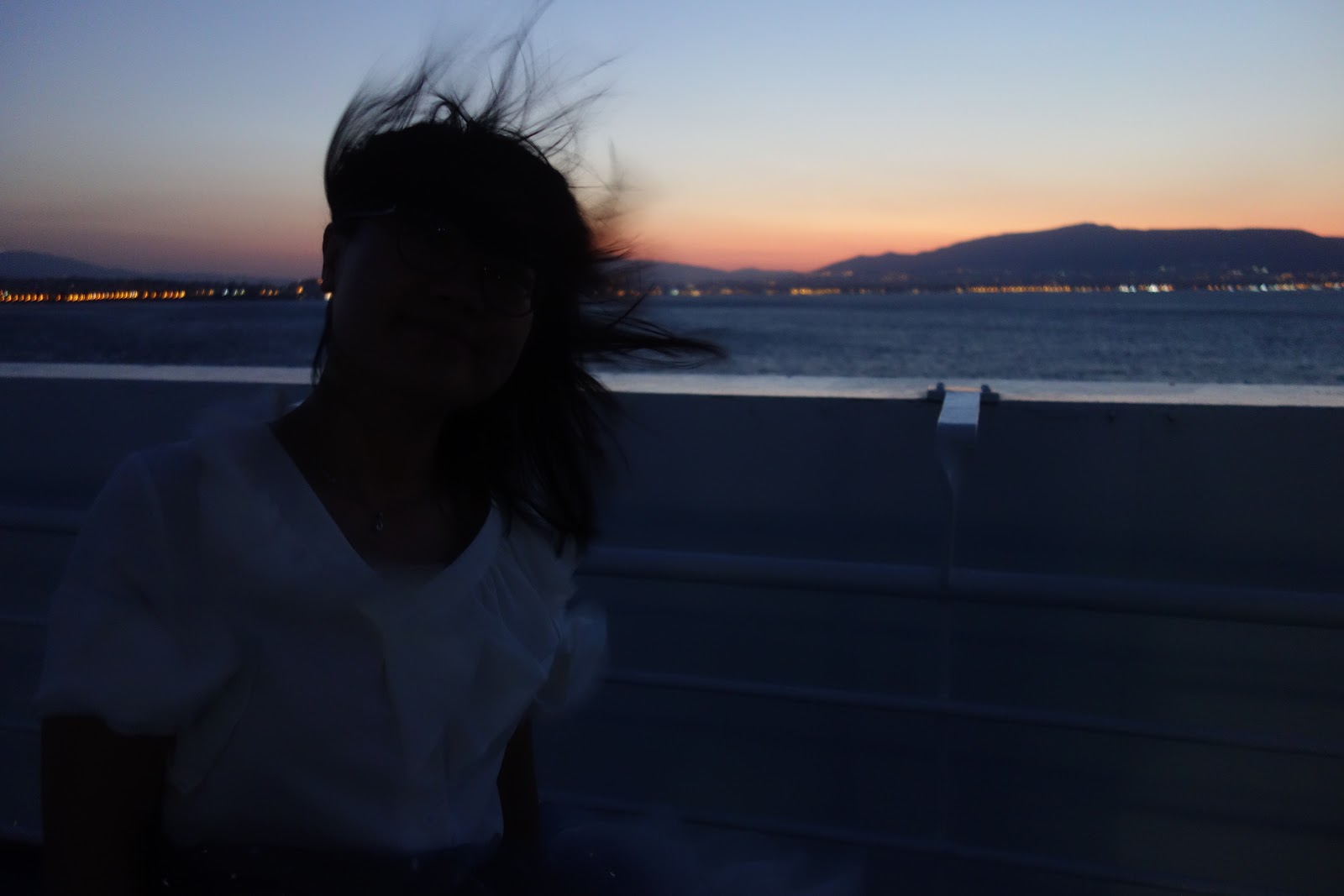 放下行李后,我们兴奋地跑去甲板玩了下,天已经全黑,岸的方向灯火辉煌,水的方向也能看到整齐排列的灯,应该是给夜行的船照明的。海风简直太大了,身体有一种要被吹飞的感觉。我们玩了好一会儿才肯下甲板。我累得不行了,洗漱完就躺下了,带上耳塞,还在播放广播的时候我就已经睡着了。毕竟第二天还要早起,因为天不亮大概六点船就要靠岸了