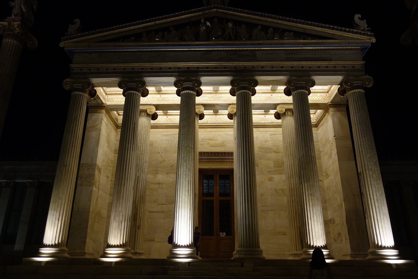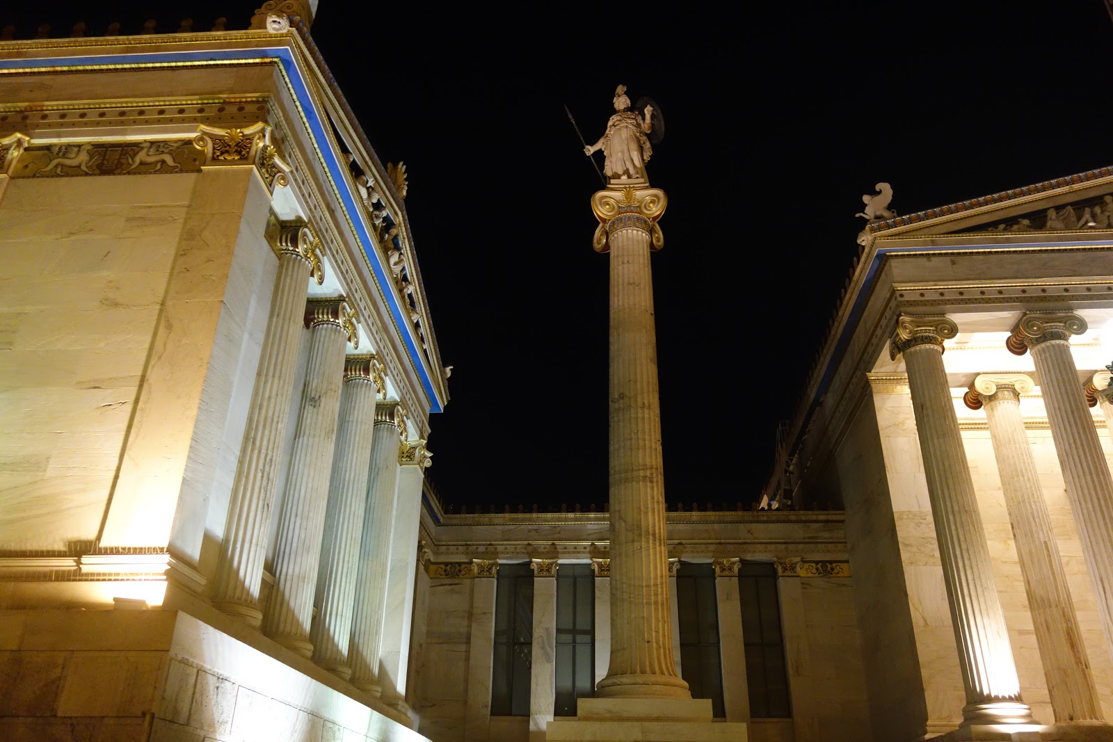 吃完饭夜幕已经完全降临,我们步行回宾馆。路上还路过了雅典科学院,门口竖立着雅典娜的雕像,非常有气势。我们拍了很多照片。快到宾馆的时候买好了第二天的瓶装水,为第二天的阳光沙滩行做好准备。