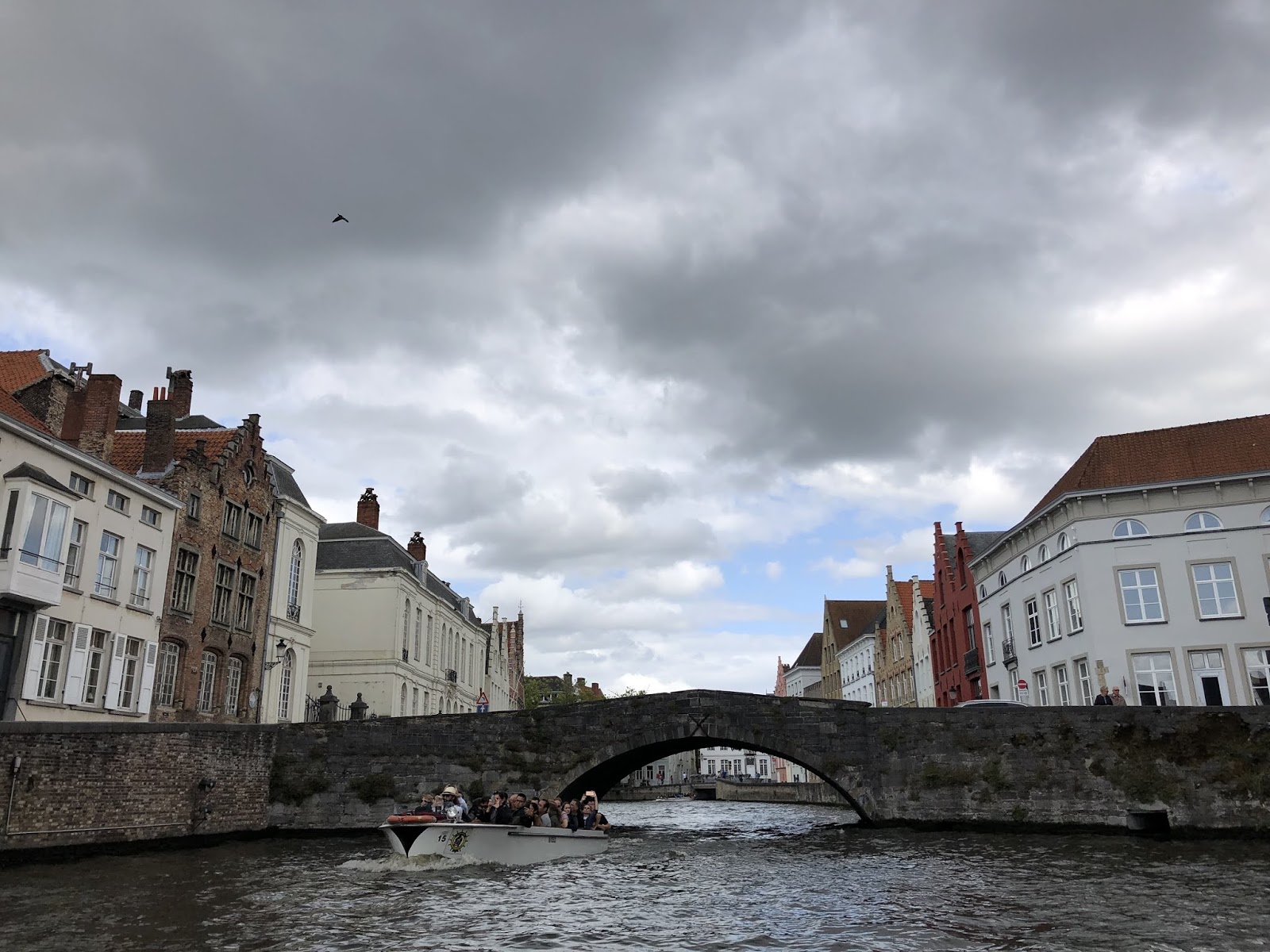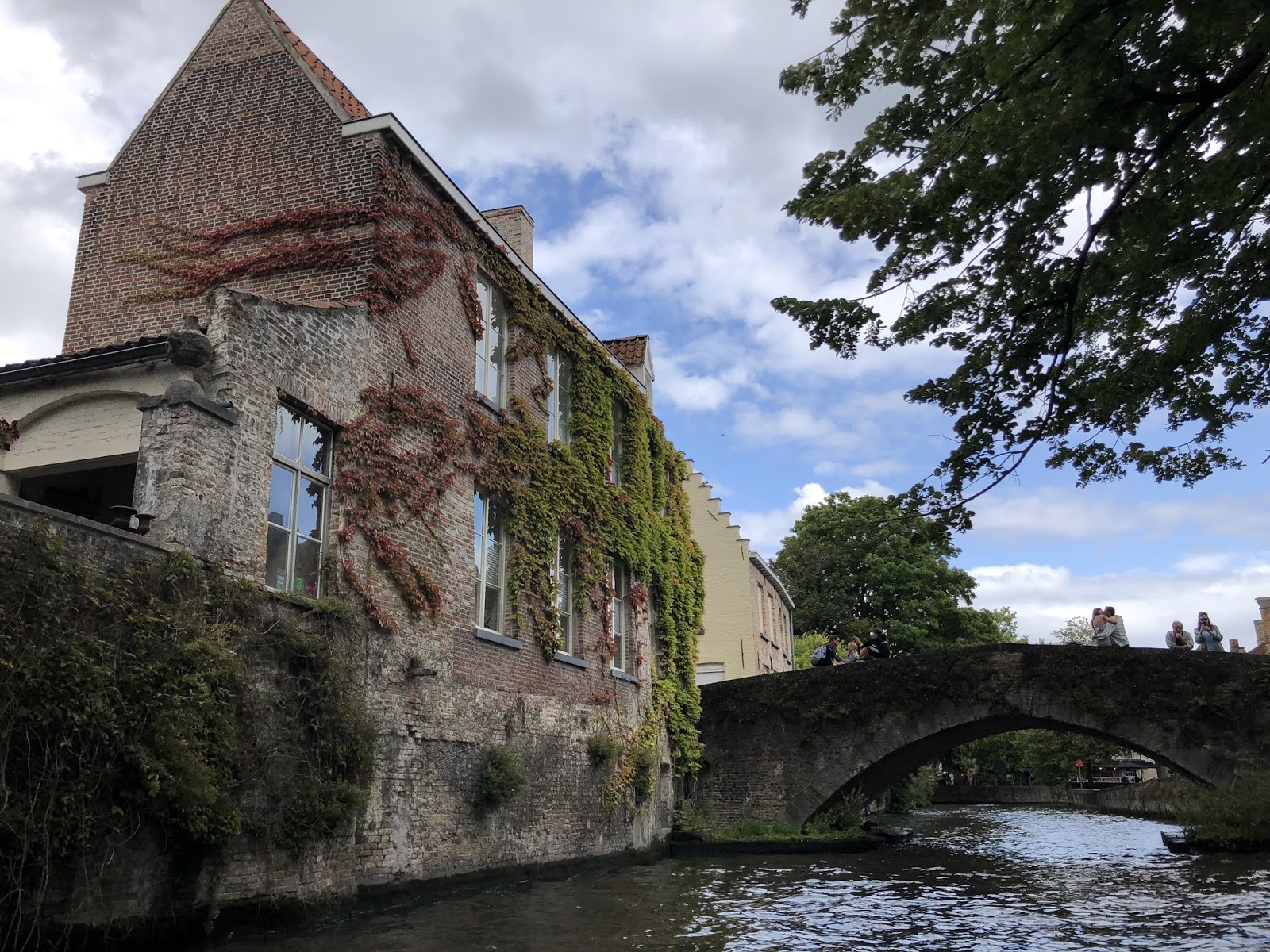 布鲁日在荷语中的意思是桥,这是一座以桥闻名的小城,有大大小小不计其数的桥横跨在运河之上;布鲁日是典型的中世纪古城,城市内保留着大量的哥特式建筑;布鲁日也是一座宗教意味很浓厚的城市,走在城市里,三步一座小教堂,五步一座大教堂;布鲁日是一座很文艺的城市,花店、马车、石板路、还有街边表演的乐手,处处都氤氲着浪漫的气息;布鲁日被称作“北方威尼斯”,因为有一条叫莱茵的河流经市中心,河两岸也布满了古老的建筑。我们买了船票打算搭游船游览这副油画卷,这也是所有来布鲁日游客的必选项。我们似懂非懂地听着导游一遍荷兰语一遍英语的讲解,看着两岸缓缓移动的建筑和桥上慢悠悠交谈的每一位游客,感受着时有时无的灿烂的阳光,突然觉得很享受当下的这一刻。也许这就是幸福吧。