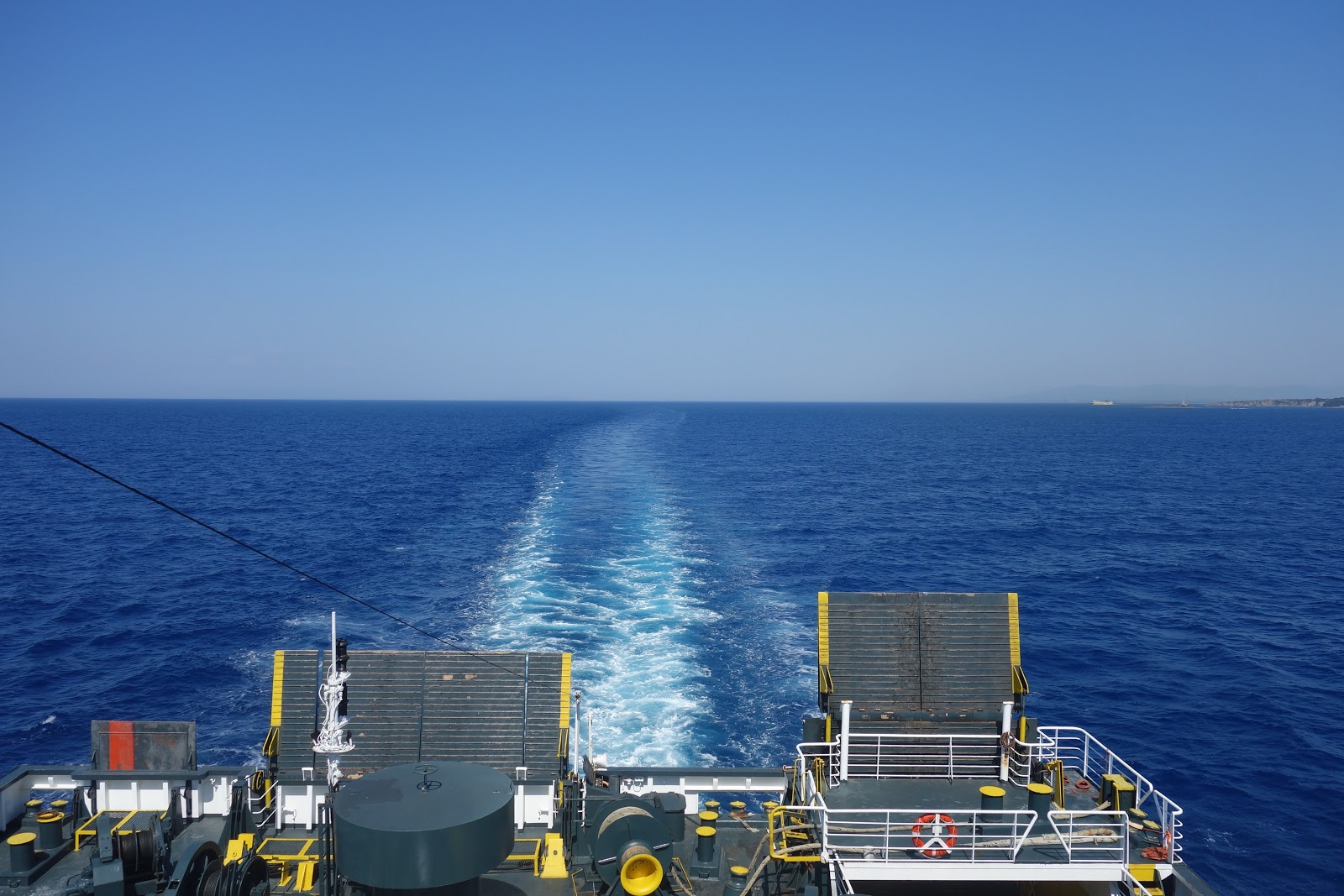 果然熊八点准时收到一个电话,司机说一会儿就到,看来希腊人还是比较守时守承诺的。来接我们的是个小车,车上还有其他游客。感觉我们像是散客,这是司机接的私活。果然,车把我们接到码头,码头旁还有好几辆大巴,大巴接的应该都是正规渠道接的游客。Anyway,我们也算是在最后一刻抢到了船票了。我们把钱给了接我们的司机,就上船了。去沉船湾只能坐船才能抵达。这是一艘小船,类似于快艇,我们发现船上除了我们还有一个亚裔面孔的阿姨。坐上船我俩又是很兴奋,各种拍照。我们坐在船尾,感觉伸手就能碰到海水。船开得很快,留下一路雪白的浪花。