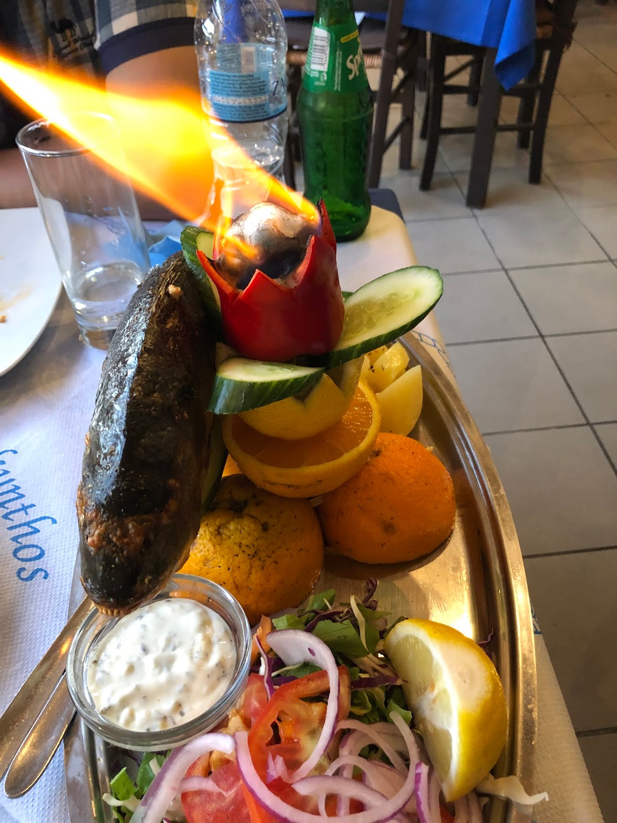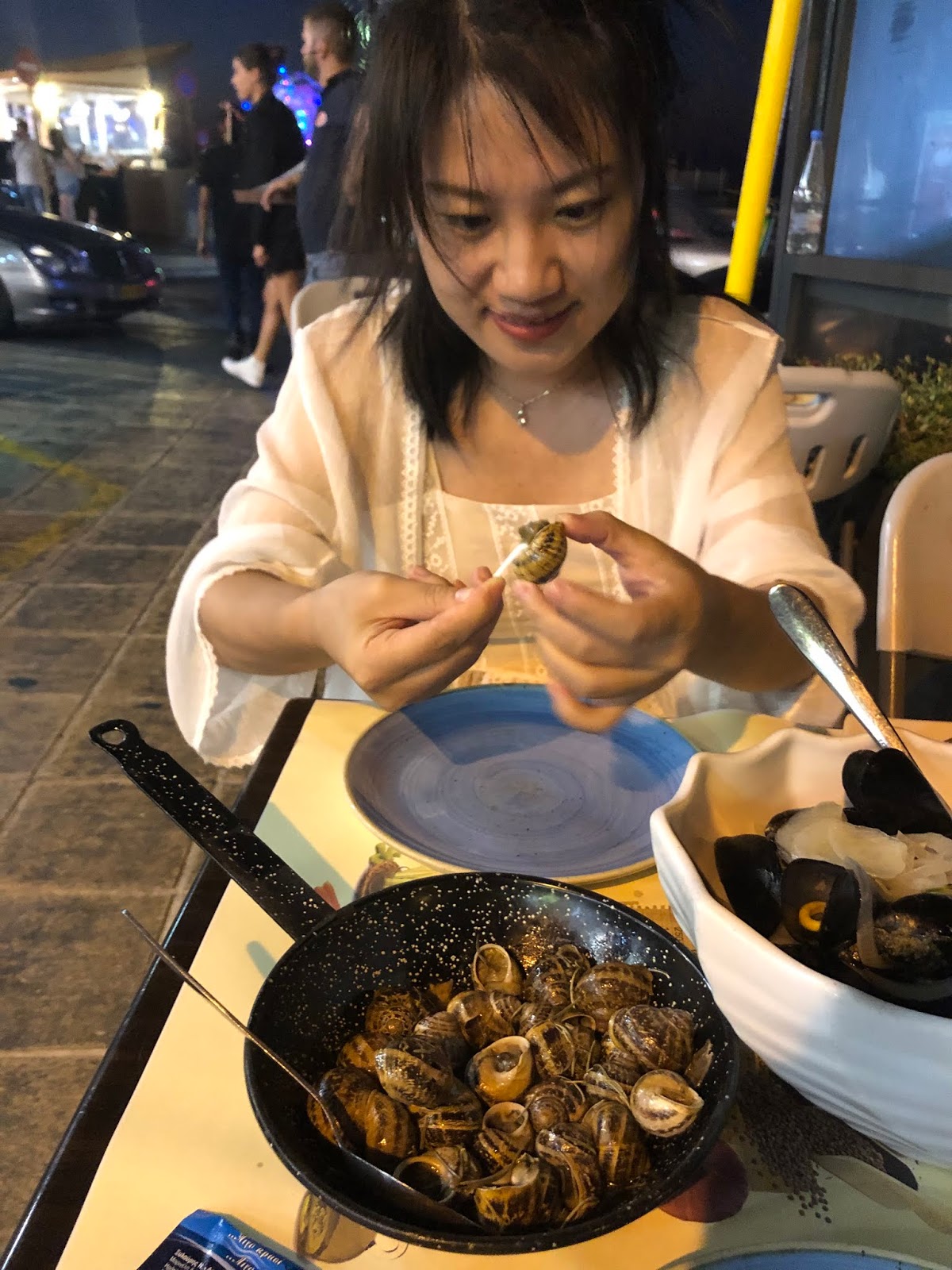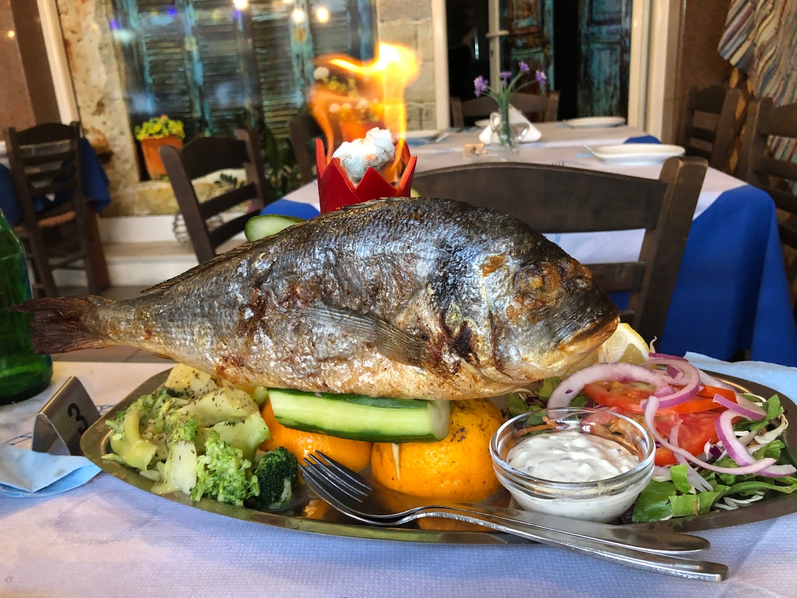 海对面的岸上是美食街,餐馆竞争特别激烈,每一家门口都有人招呼,我们选了一家看起来特别热闹的希腊风味餐厅。我们特意要求坐在外面,这样可以就着对面爱琴海送来的海风和海浪拍打岩石的声音,吃一顿正宗的海鲜大餐。那时夜幕还没有完全落下,天空深蓝色,海风咸咸的,听着那些来自你完全不熟悉的文化的人们的交谈声、店员热闹的吆喝声,看着眼前你不是很经常吃得到的美食……感叹一下,也许这就是旅行的意义吧!不光是看见不同的风景,还要看见不同的世界,不同的文化,不同的故事,不同的一草一木一……然后去用心体验。我们点了好多好多,不知道是因为点了太多,还是这里中国人太少,还是我们吃了太久,最后餐馆还免费送了一份甜点,一个果盘,一瓶白酒。对希腊的好感加了一分!