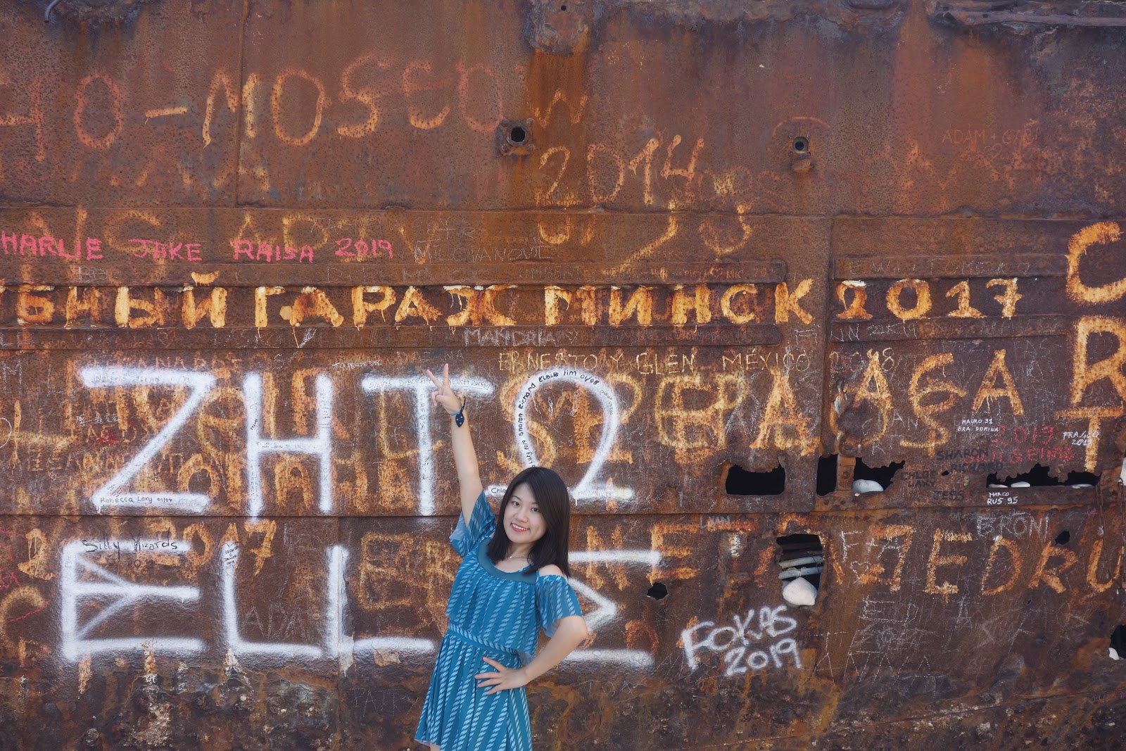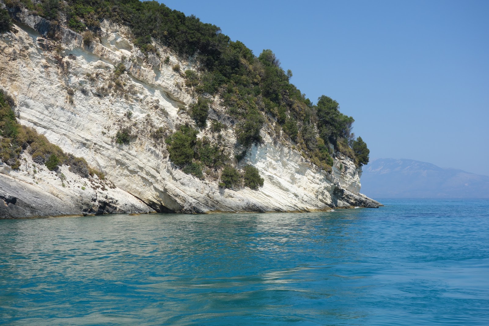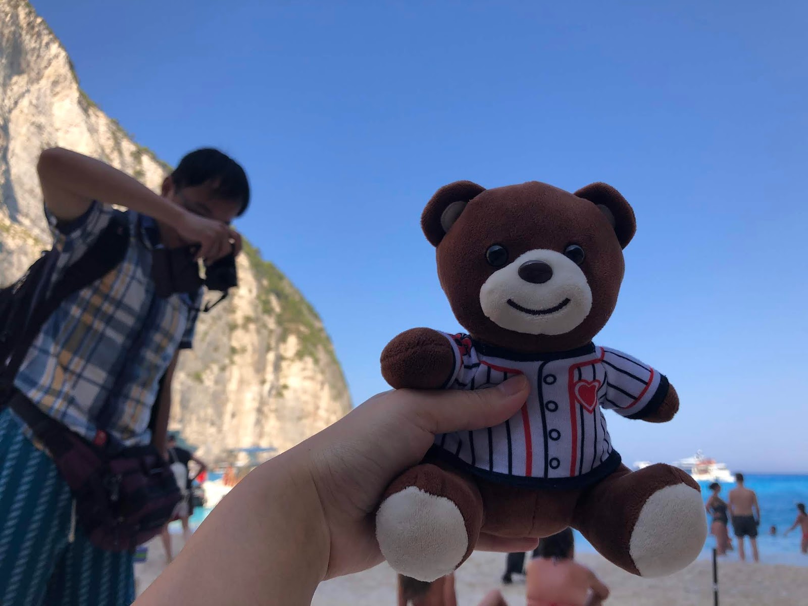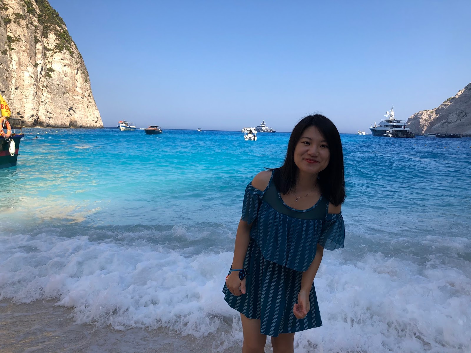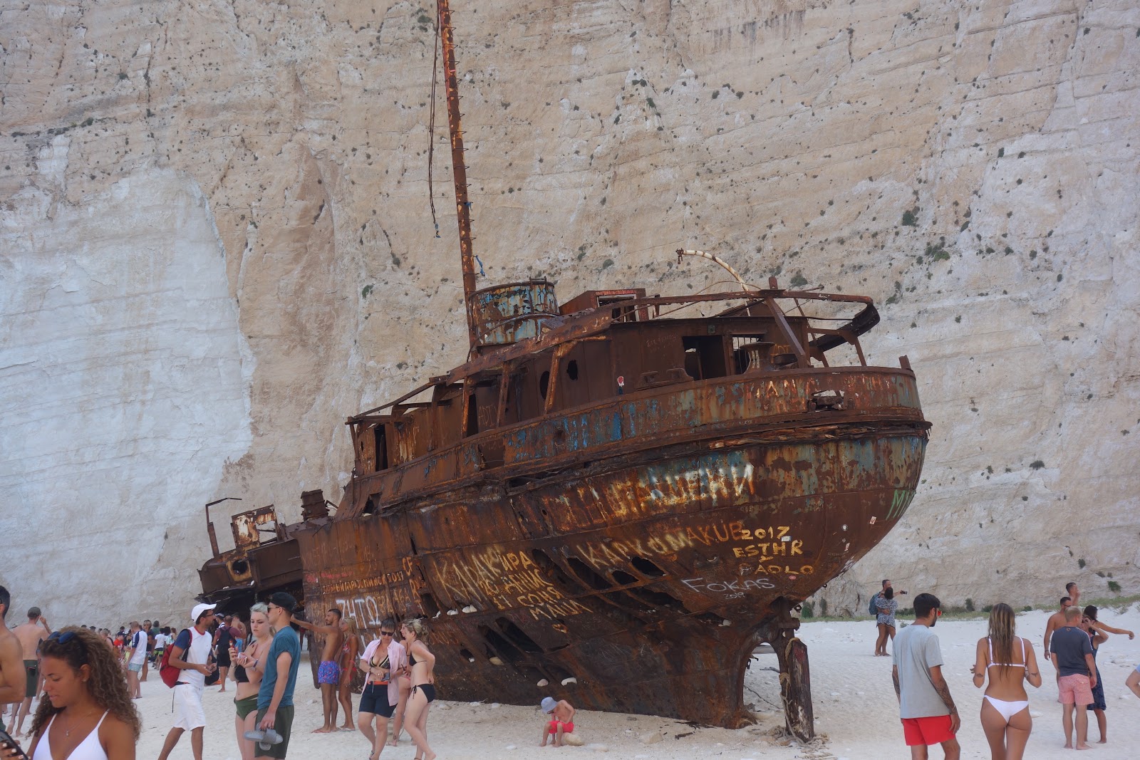 船开了没多久就到了我心心念念的沉船湾了。来希腊之前有一次电脑屏保给我推荐这个地方,当时就被照片的美景震撼到,没想到一个月之后我就身临其境了。沉船湾真的太美了,海水蓝得像是倒了染色剂,游客很多。岸边是一座船的遗骸,沉船湾也因此得名。据说这艘船是一艘走私船,1980年的一天,由于恶劣的天气在此搁浅。沉船湾周围都是峭壁,雪白的沙滩再加上湛蓝的海水,景色极为优美。我们赶紧下船玩耍,只有半个小时的时间。还好我俩都穿着泳衣来的,我们跑到沙滩上拍了很多照片。只不过沙滩的石头太咯脚了,站太久还是受不了。
