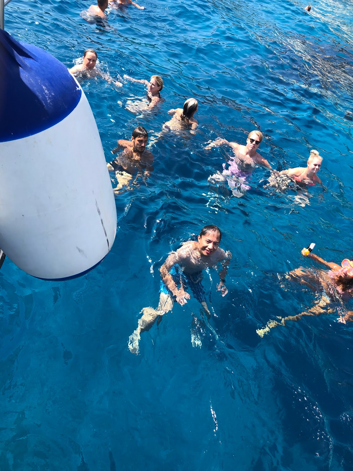 半个小时后我们的船来接我们,下一站是蓝洞。蓝洞是峭壁上的洞穴,因为没有沙滩,蓝洞的玩耍方式就是跳下去游泳,或者在船上拍照。会游泳的游客一个个跳到蓝色的海水里游泳,完全不会游泳又高估自己水性的我也跟着熊一起跳进水里了。虽然熊一直拖着我,但我还是狂叫不已,那一刻感觉自己要掉进深海里死掉了。狂叫了一路,熊把我抱到了船上,这才感觉小命捡回来了。事后熊跟我说,那时他感觉自己抱着一头死猪。。。